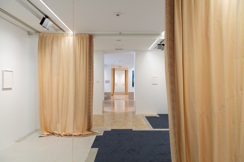 Bringing together major works from recent years with new site-specific interventions, the exhibition transforms the architecture of the Twin Galleries. At its center, a new commission reproduces the floor of the artist’s family home, turning memory into structure and setting a rhythm of displacement and re-composition. Embroidered partitions, reopened apertures, and fragments of discarded paper translate temporal drift and domestic entropy into material form. Through crossings, asymmetries, and intentional misfits, the works disturb both the memory of the Sursock house and the artist’s own dislocations, generating a precise yet elusive intensity.